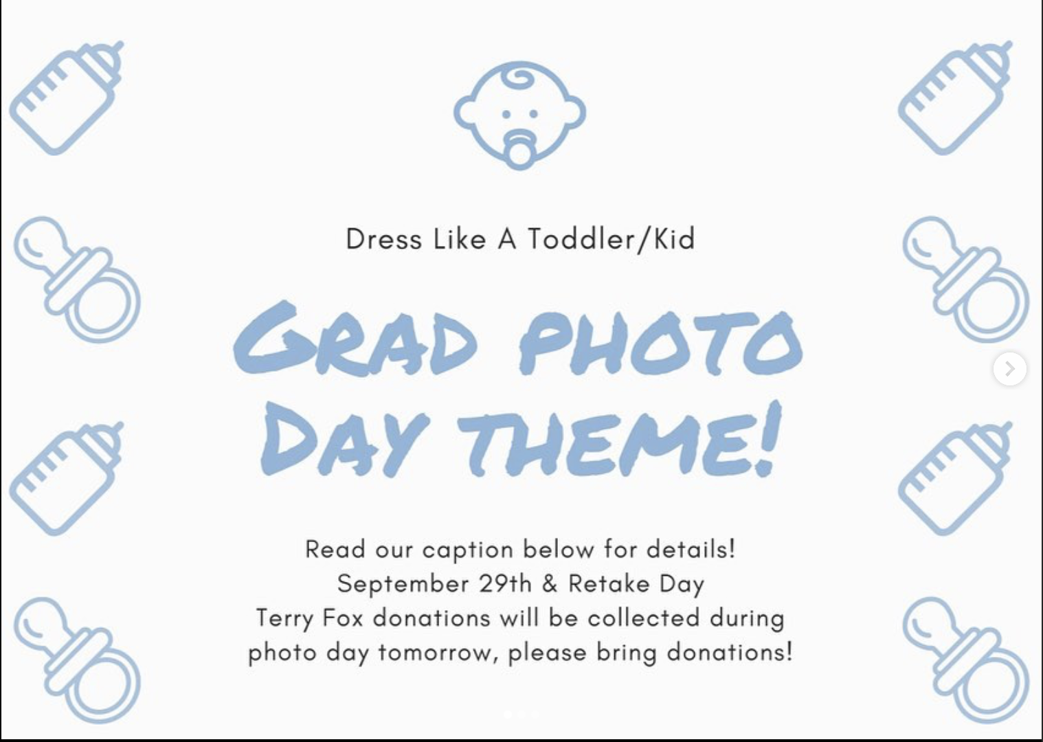 Hey grads! Our theme for tomorrow’s Artona photos is Dress like a Toddler/Kid. As always, participation is optional! Some inspiration ideas will be in the next slides, but some ideas are onsies, kid pajamas, pigtails, stuffies, sleeping masks, soothers, etc. Please do NOT wear anything that will make you unrecognizable (ie. fake glasses) and keep it appropriate as artona has the right to refuse your photo. Hats and unnatural makeup are not allowed. Please DM us if you have any questions about your outfit! Bring donations for the Terry Fox Foundation tomorrow!